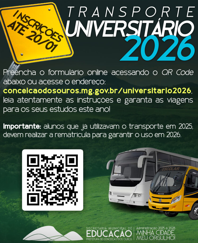 A Secretaria Municipal de Educação informa que o período de cadastro e recadastro para a utilização do Transporte Universitário gratuito no ano de 2026está aberto.